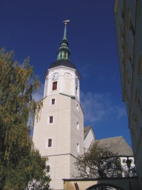 Der Turm in seinen unteren Teilen aus der Zeit von 1489, ist 51m hoch und stammt in der heutigen Form aus der Zeit nach dem 30-jährigen Krieg.